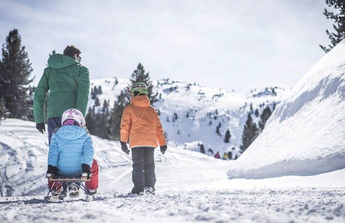 Family sledding through snowy Dolomite landscape